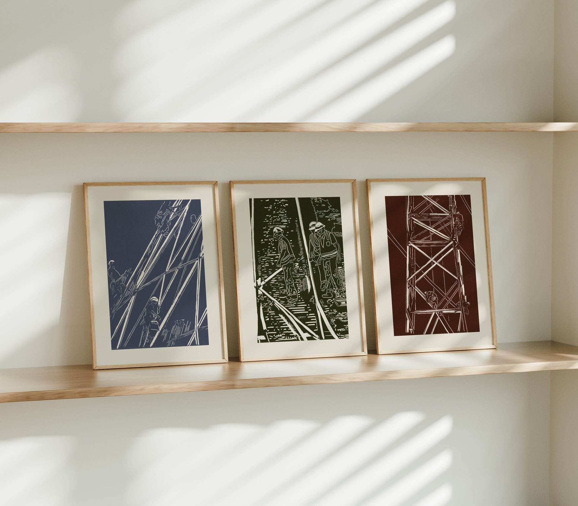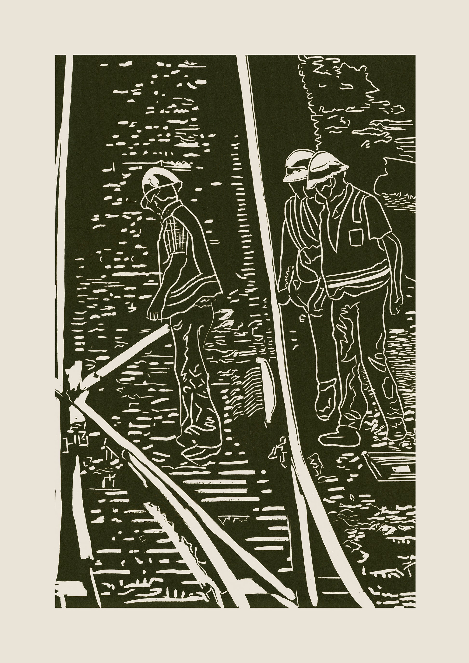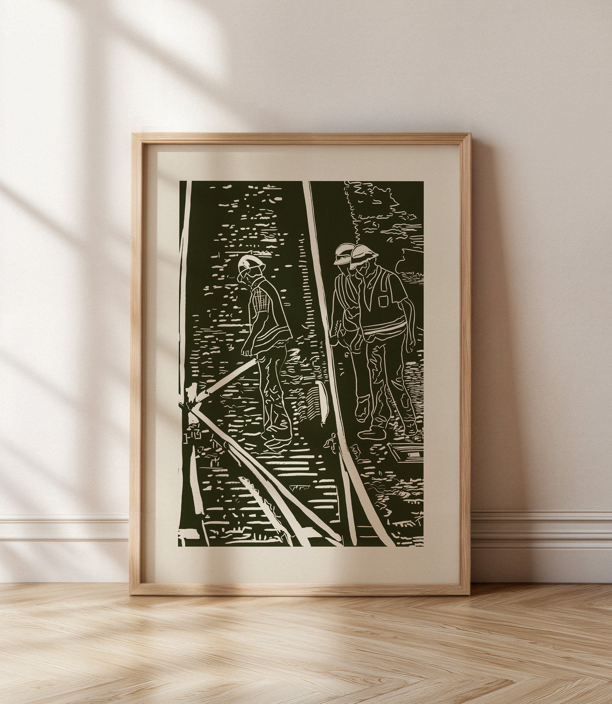 Part of the Working London series. This piece highlights the engineers who meticulously maintain the train tracks, ensuring the smooth operation of London’s transport network. Offering a glimpse into the quiet precision required to keep the lifeblood of London’s railway system running seamlessly. Originally created as a lino cut and reproduced as a fine art print.
